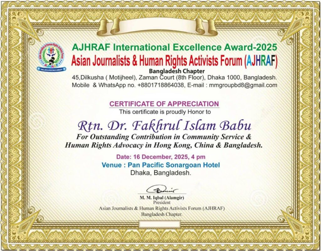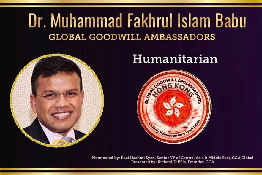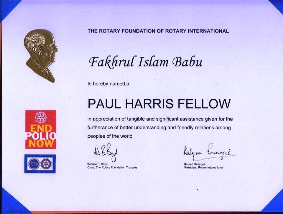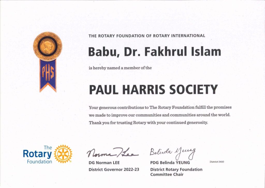 Dr. Fakhrul is an active Rotarian with a long-standing involvement in Rotary service and philanthropy. He is a Major Donor (MD), Paul Harris Fellow (PHF), Benefactor (B), and Paul Harris Society (PHS) Member of Rotary International.