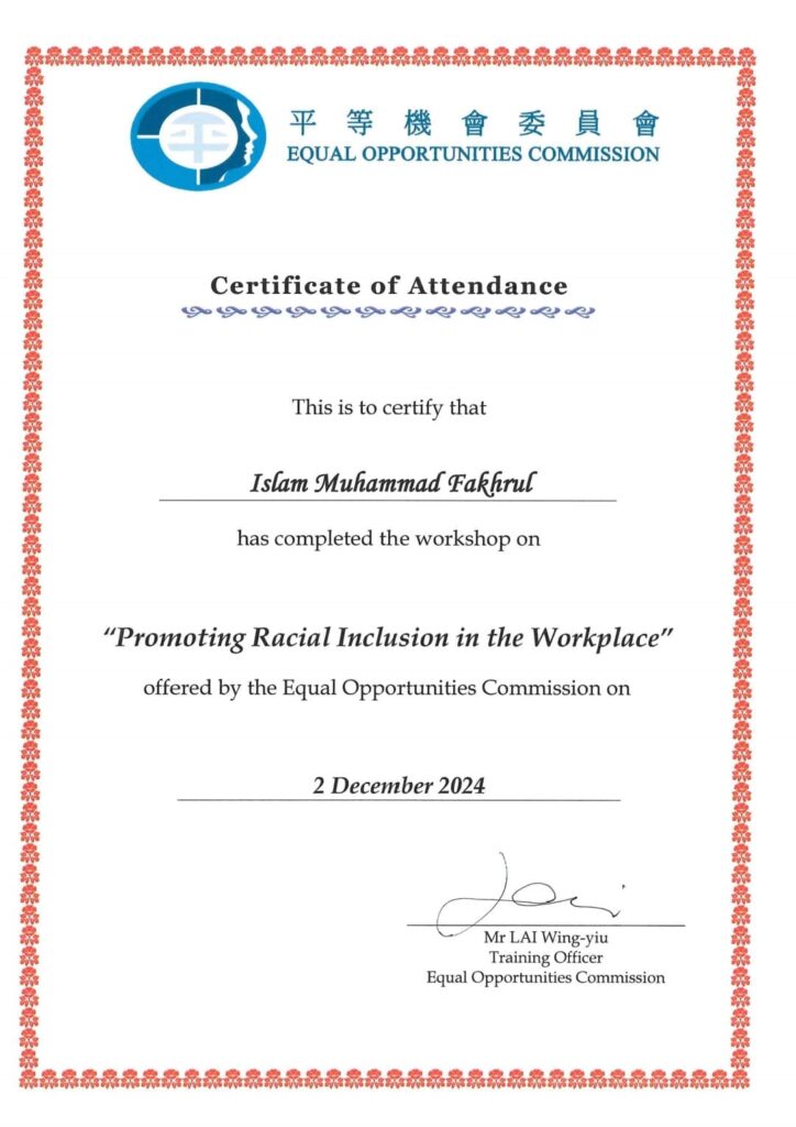 Dr. Fakhrul is active in district and community networks in Hong Kong, including mentoring and family-support roles. He serves as a Parents Ambassador for the Chinese YMCA of Hong Kong and is a mentor in the Home Affairs Department’s Yau Tsim Mong District Mentorship Program. He also encourages civic duty among ethnic minorities, including assisting with voter registration for the 2025 Legislative Council General Election.
